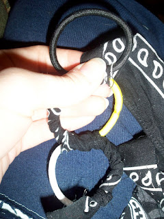 So... however you got here... you have a long strip of ribbon or fabric and about 10 hair ties! I wanted enough to make it stay, but I didn't want it to be so tight that there weren't circles on your head when you wore it.